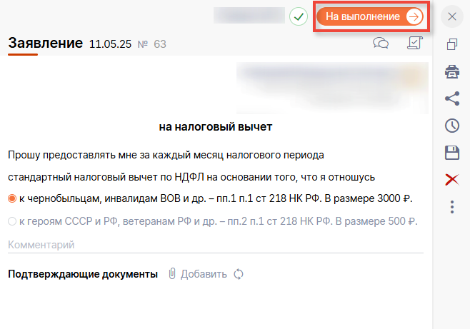 Откроется документ. После его заполнения необходимо нажать справа сверху на кнопку "На выполнение"