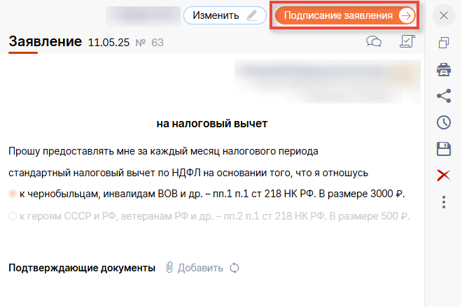 Сформируется заявление, которое необходимо подписать. Для этого нажмите кнопку "Подписание заявления" - "Подписать"
