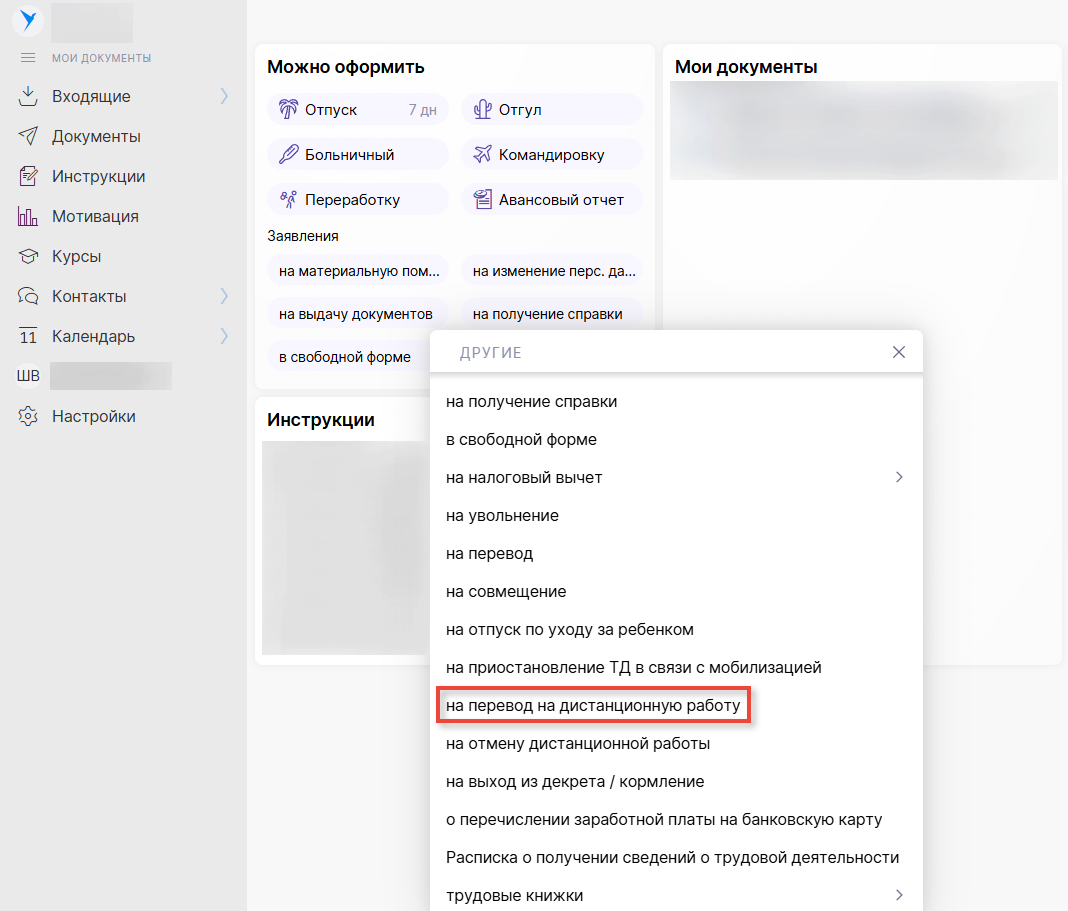 Чтобы сформировать заявление необходимо на главной странице Saby My в виджете "Заявления" выбрать "на перевод на дистанционную работу"