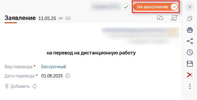 Откроется документ. После его заполнения необходимо нажать справа сверху на кнопку "На выполнение"