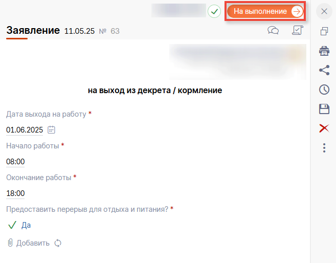 Откроется документ. После его заполнения необходимо нажать справа сверху на кнопку "На выполнение"